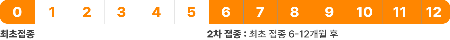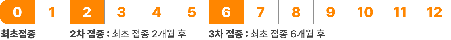 - 2차 접종은 1차 접종 후 최소 1개월, 3차 접종은 2차 접종 후 최소 3개월 이후에 이루어져야 하며 1년 내에 3회 접종을 모두 완료해야 합니다.